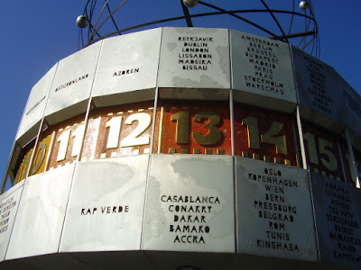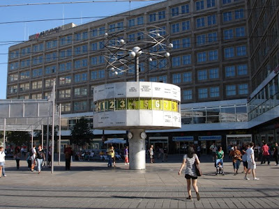 Ao centro da praça, uma complexa fonte metálica (fortemente grafitada) - a Brunnen der Völkerfreundschaft ("Fonte da Amizade entre os Povos") - remanescente do período comunista, abarrotava de pessoas a tentar refrescar os pés perante o calor persistente, apesar da extensa sombra fornecida pelos edifícios. Mais a sul, a um canto, o famoso Weltzeituhr continuava a indicar a hora em várias cidades mundiais. Noutro canto, uma exposição ao ar livre relatava a história da reunificação alemã (por sinal, bastante interessante, mas não dava para ver tudo ao pormenor, ou certamente ficaríamos até de noite).