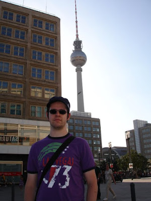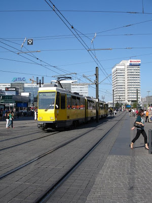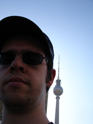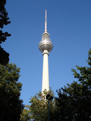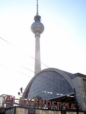 A primeira coisa que se cola à retina, mal se sai da estação de U-Bahn, é a torre de TV - a Fernsehturm. Com os seus 365 metros de altura (!) é a 4ª estrutura mais alta da Europa. Imperiosa, domina os céus da cidade e espreitava por detrás dos edifícios que rodeiam a praça. Era nossa intenção subir até à plataforma de observação (204 metros), mas quando percebemos que a subida era efectuada em grupos de 50 ou mais pessoas e que teríamos de esperar mais de meia hora... desistimos. Mas isto também já foi quase ao fim do dia: estávamos bastante cansados e com vontade é de chegar ao hotel. Se estivessemos mais frescos e com tempo, teriamos esperado na boa, já que em Portugal dificilmente conseguiremos ter igual oportunidade, no futuro. Fica para outra.