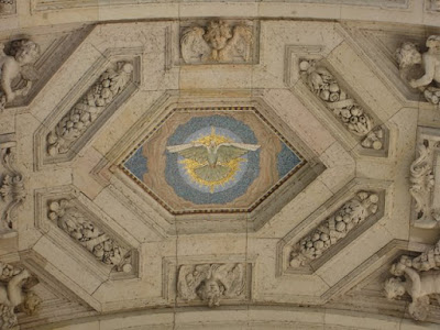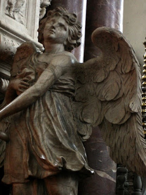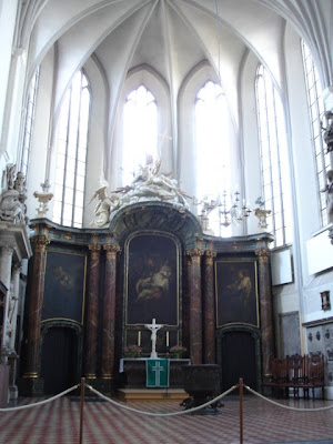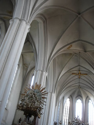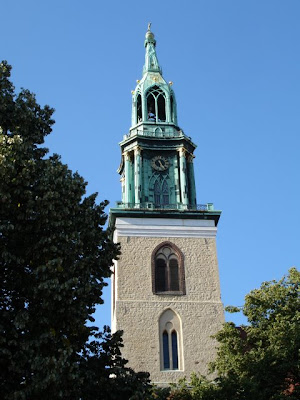 Dali, demos um saltinho à Igreja de Santa Maria (Marienkirche), a mais velha de Berlim. Gótica de nascença - com uma fachada a tijolo que inspirou a Rathaus, certamente - mas com uma torre barroca de um bonito tom verde. Grande parte do seu interior estava em obras, mas isso não afectava o fluxo de visitantes e deu perfeitamente para tirar umas fotos.