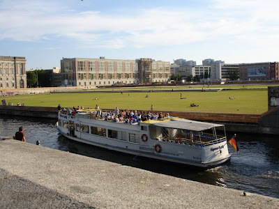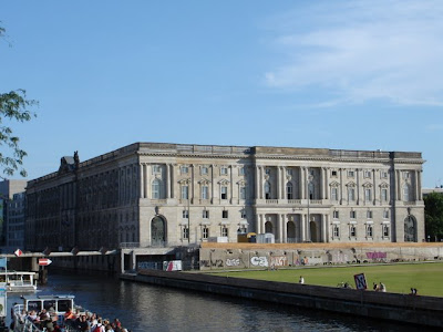 Encostámo-nos por um bocado num muro junto à ponte Schlossbrücke, que atravessa o estreitinho rio Spree, em direcção à Spreeinsel. No quarteirão de Cölln, em plena ilha, abria-se a Schloßplatz, um enorme espaço relvado onde, até há um ano, se erguia o Palast der Republik (Palácio da República), antiga sede do parlamento da RDA; antes dele, existiu o Palácio Real (Stadtschloss), residência urbana dos reis da Prússia e dos imperadores da Alemanha.