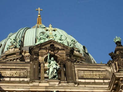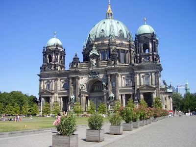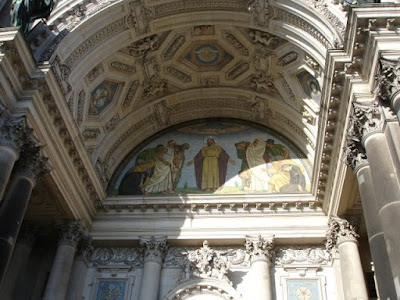 Atravessámos a ponte para a ilha, para investigar um outro edifício de elevada majestosidade arquitectónica que já nos tinha suscitado interesse ao longe, pela sua enorme cúpula. Graças aos mapas pouco esclarecedores do nosso guia, andámos um pouco perdidos quanto ao o-que-era-o-quê, nesta zona da cidade. Assim, já na Museumsinsel (Ilha dos Museus), no cantinho que a Karl-Liebknecht-Straße faz com o rio, constatámos finalmente, que era (e só podia ser, mesmo) a Berliner Dom, a Catedral de Berlim. Faltam-me adjectivos que já não tenha usado para descrever a incrível beleza e sumptuosidade desta igreja... Só visto! Nem mesmo a pedra suja do passar do tempo (e poluição) - que andavam naquela altura a limpar, por acaso - tiram-lhe o "brilho". Entusiasmados com a ideia de visitar o seu interior e ir até à cúpula, demos de caras com uma enorme fila para comprar bilhetes... a 8 Euros. O problema foi que, como tivemos a pontaria de apanhar uma missa a decorrer, mesmo que tivessemos comprado as entradas teríamos de esperar que terminasse. 'Tá bem... xau aí. Não se pode ter tudo.