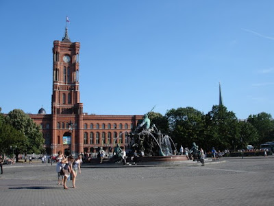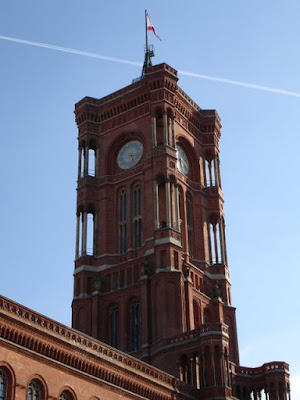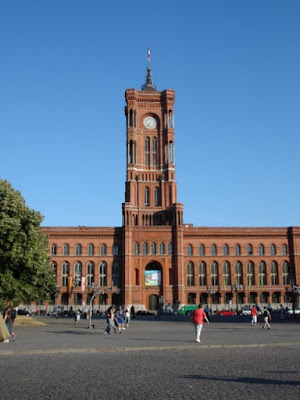 Apesar da omnipresente Fernsehturm, outro edifício conseguia captar o nosso olhar: o da Câmara Municipal ou Berliner Rathaus, mais conhecida por Rotes Rathaus (Câmara Municipal Vermelha), devido à sua fachada totalmente em tijolo vermelho. No alto da imponente torre central, esvoaçava a bandeira vermelha e branca com o urso, símbolo da cidade, confirmando que ali era a sede administrativa da cidade.