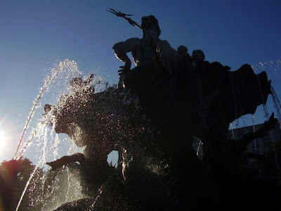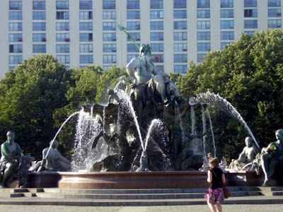 Em frente à Rathaus, no ponto central de uma ampla praça ajardinada - e, surpresa surpresa... bastante movimentada - pudemos observar a majestosa fonte de Neptuno (Neptunbrunnen), com o deus mitológico no topo, rodeado de quatro figuras femininas representando os rios Reno, Elba, Vístula, e Óder.