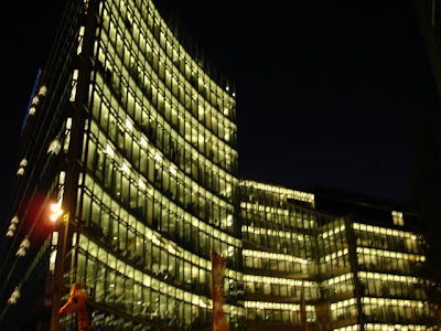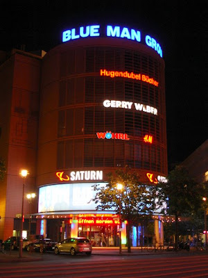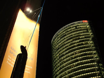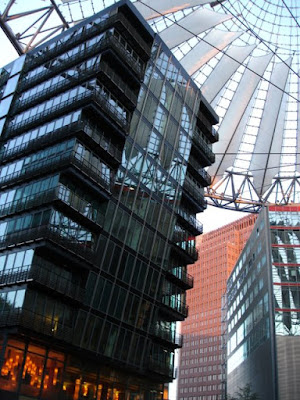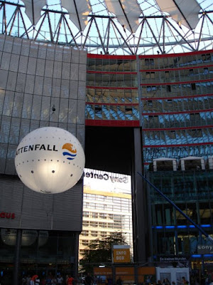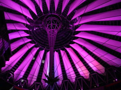 Com a fome a apertar e vários quilómetros nos pés, lá demos com o complexo da Sony Center (mais conhecido por "Praça Sony") a meio da Potsdamer Straße, no interior do qual encontramos, finalmente!, um sítio onde pudemos comer bem, barato... e sentados! E não podíamos, de facto, ter escolhido melhor local. Único pelo seu conceito arquitectónico de espaço público, de estética, e arrojo de engenharia, graças à enorme cobertura em forma de tenda. E o espectáculo começa mesmo após o anoitecer, quando a cobertura se torna uma enorme tela para um incrível show de luzes e cor. A comida até soube melhor! Foi um início de noite super agradável, pontuado com várias exclamações de júbilo por parte dos muitos alemães que assistiam à performance dos seus atletas nos Mundiais, através de um gigantesco ecrã.